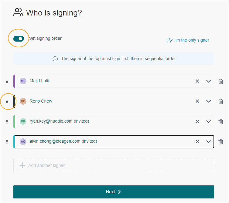 Step 3: With multiple signers the order in which the signing occurs can be managed by enabling the Set signing order toggle at the top and then clicking and dragging the dots besides each name to reorder its position.