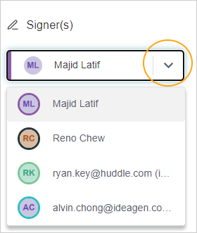 Step 1: If multiple signers have been chosen to sign the document select the first signer from the Signers dropdown by clicking on the down chevron icon - by default the first signer will be selected.