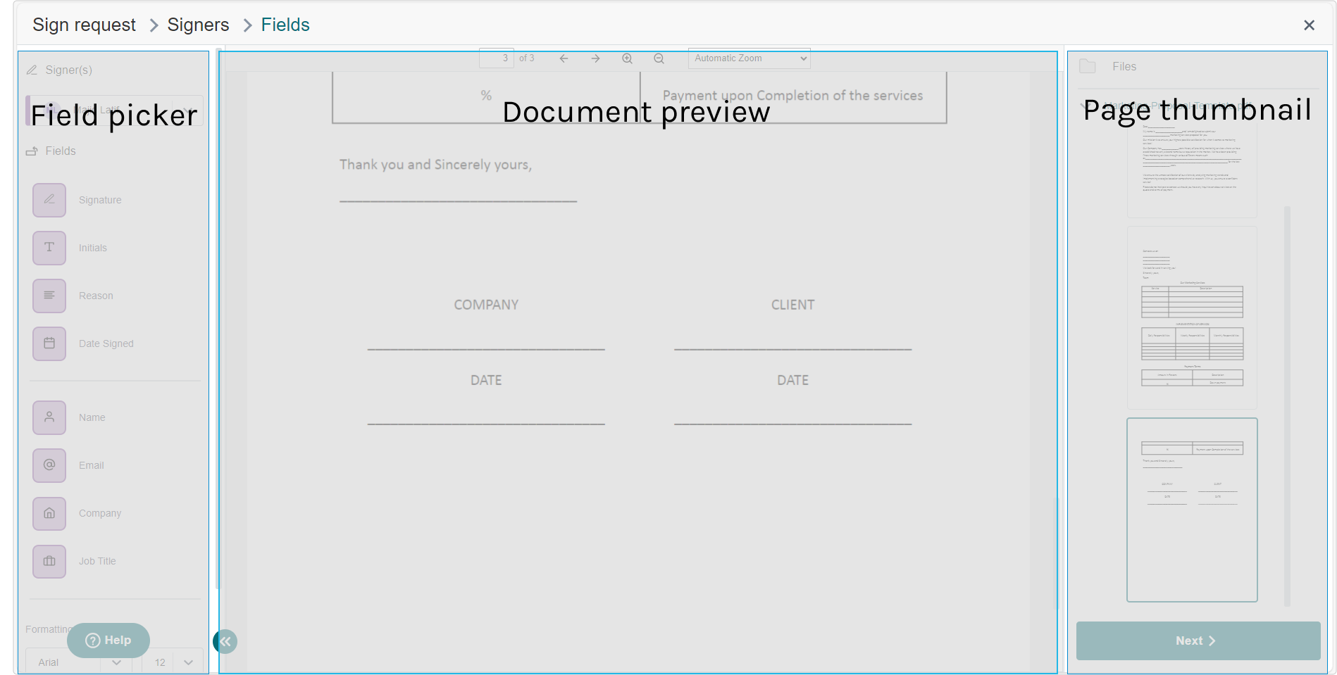 Step 2: With the first signer selected navigate to the page where the first signature box needs to be placed. In standard signing the Signature field is the only mandatory field. To navigate large documents use the thumbnail viewer to find the page quicker - clicking on a thumbnail will reposition the document preview pane onto that page.