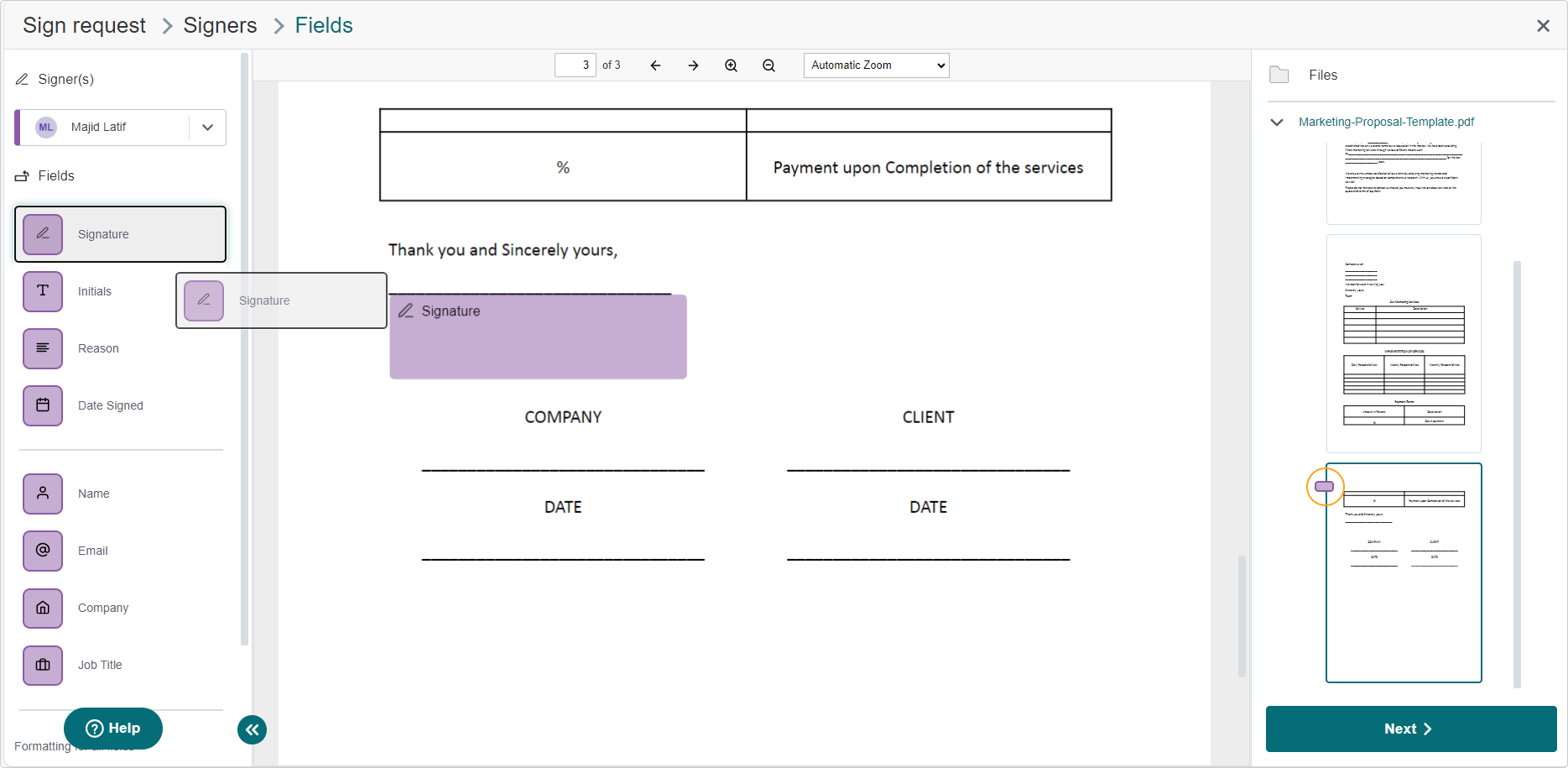 From here simply drag the Signature icon in the field picker and place it on the page in the main document preview pane.