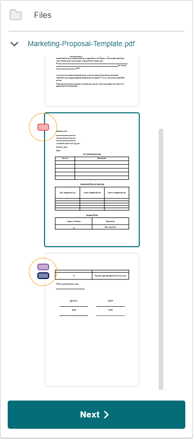 Step 3: With the first signer done you can now repeat the action with each signer. The page thumbnail view shows an icon identifying the page where each field has been placed using colours to denote which user the field is associated with.