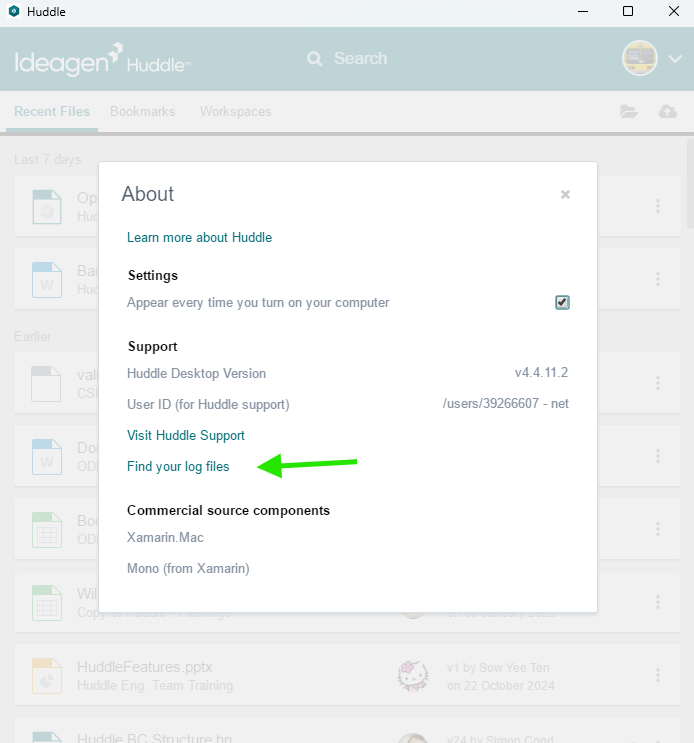 This article documents how to obtain the logs for Huddle Desktop. This should normally only be sent to Support if there is a challenge with Huddle Desktop.